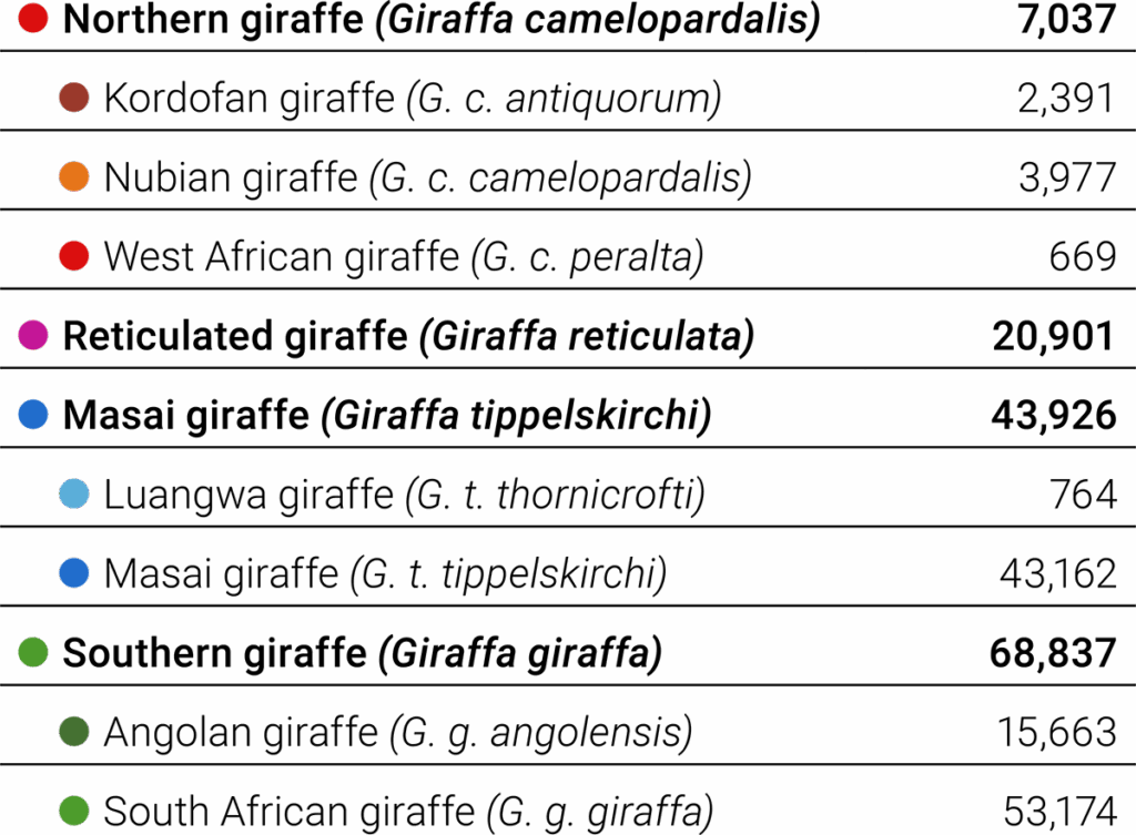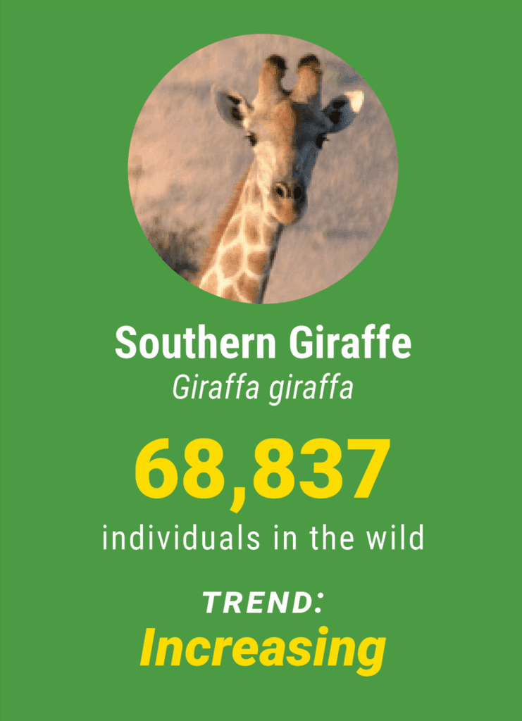 Southern giraffe – Found across southern Africa, this species shows the most remarkable growth. An estimated 68,837 individuals now roam the wild — a 50% increase in just five years, largely due to improved survey coverage and increased awareness.