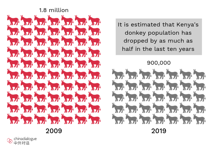 The report, which was written earlier this year but is so far unreleased, estimates that donkey numbers in Kenya have fallen by as much as half over the past ten years, from 1.8 million animals in 2009 to about 900,000 today.
