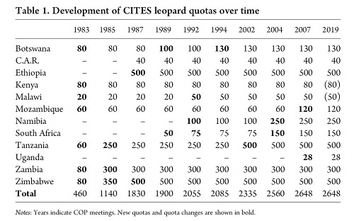 Editorial note: Many countries do not make use of their full CITES export quotas. For example, South Africa has access to a CITES export quota of 150 leopards (see table below), but in 2018 permitted a quota of seven leopards.