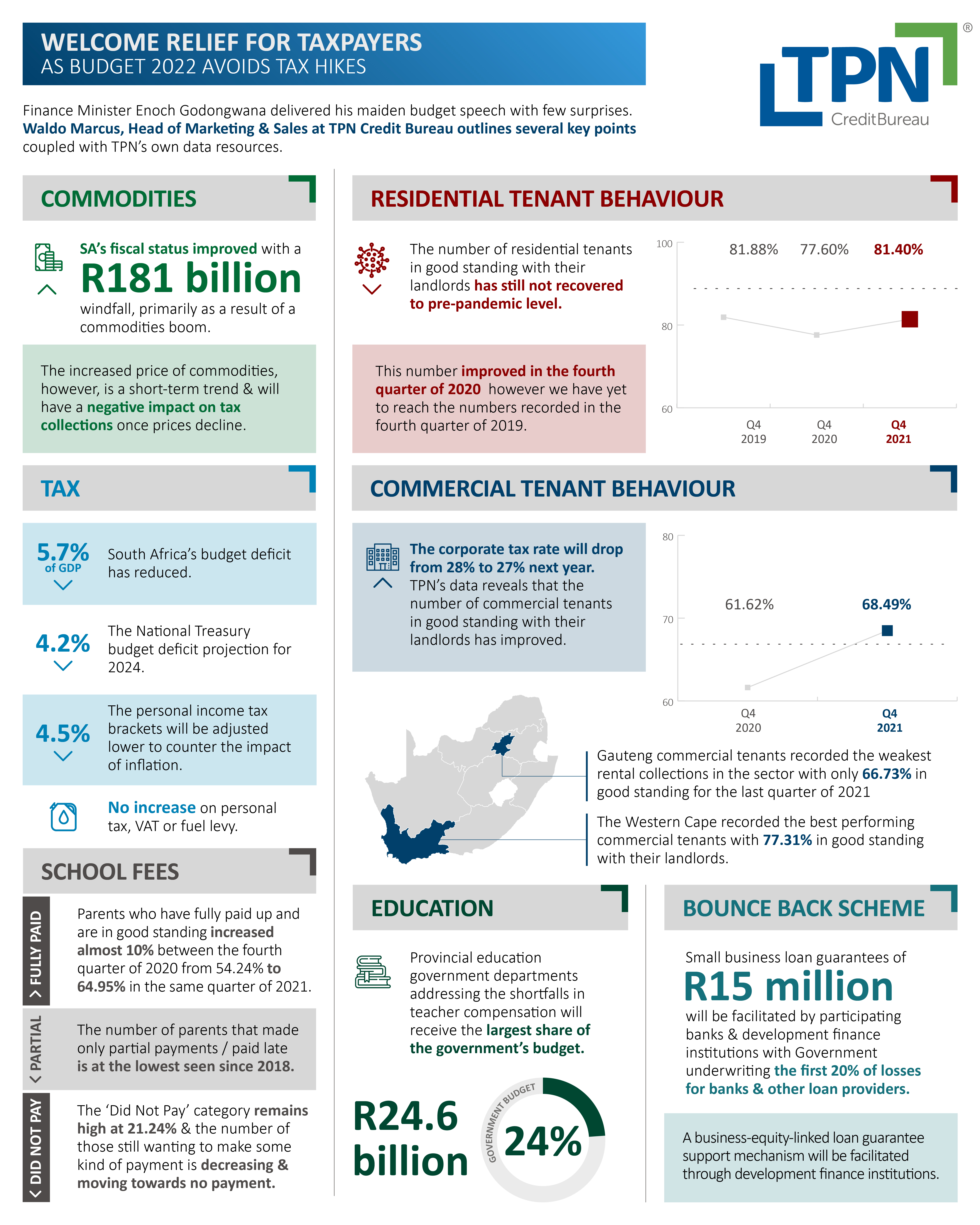 Godongwana confirmed that the corporate tax rate will drop from 28% to 27% next year, which will be good news for businesses that are still struggling to recover. TPN’s data reveals that the number of commercial tenants in good standing with their landlords has seen an improvement. This figure has grown from 61.62% for the fourth quarter of 2020 to 68.49% for the same period in 2021.
