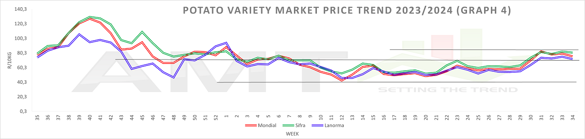 Turning to the Potato Market Price Trend for 2023/24 (Graph 3), we see that from week 40 in 2023 (October 2), the potato average prices peaked at R127/10kg and then declined until week 12 in 2024 (March 18), when they stabilized between R64/10kg and R50/10kg. In week 29 of 2024 (July 15), the price spiked again due to the impact of black frost. Following this spike, potato prices exhibited a slight downward trend until week 34 (August 19). The Potato Variety Price Trend for 2023/24 (Graph 4) closely mirrors the trend in Graph 3, unlike the more pronounced differences observed in the pepper price trends.