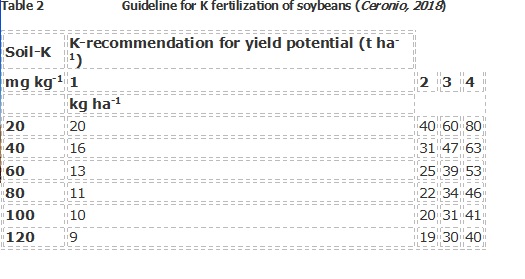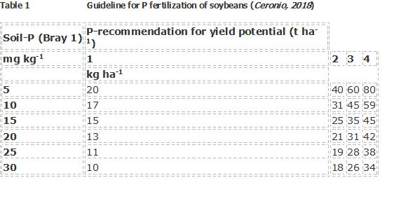 Due to the extensive root system and the soybean’s sensitivity to high concentrations of mineral salts, this crop responds more favourable to general soil fertility than to direct fertilization. It is recommended to apply phosphate and potassium broadly and to incorporate it into the soil, so that the crop can absorb these nutrients later during the growing season (AGTAG, 2019). Soils with a phosphorus status of approximately 25 to 30 mg kg-1 (Bray 1) can be considered acceptable for soybean cultivation.
