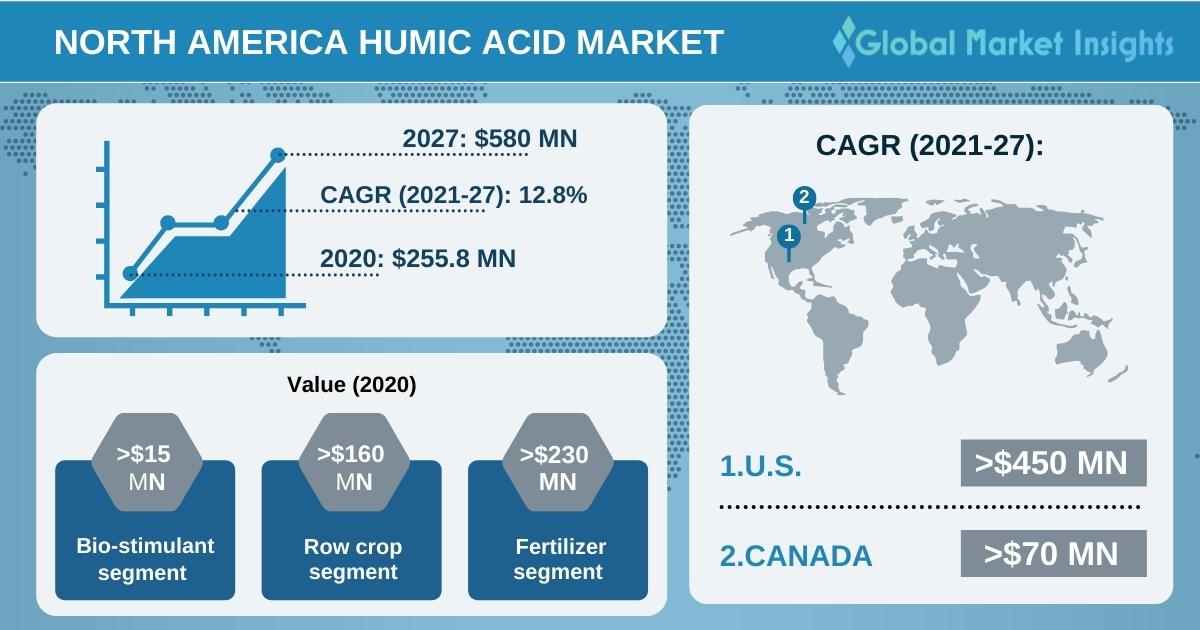 According to Global Market Insights Inc. report, it has been projected that the North America humic acid market revenue is likely to cross USD 580 million by 2027.